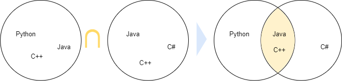 이 두 집합의 교집합은 'Java' 및 'C++' 두 요소를 포함하는 새 집합을 반환합니다.