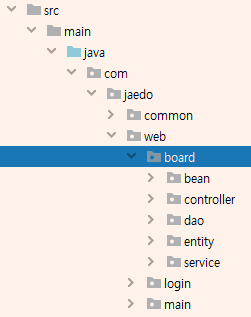 기본적으로 MVC 패턴을 사용할때, bean/controller/dao/entity/service 별로 패키지를 구성을 한다.