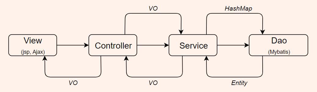 View->Controller->Service 흐름간에는 vo class 사용하여 데이타를 주고 받는다.